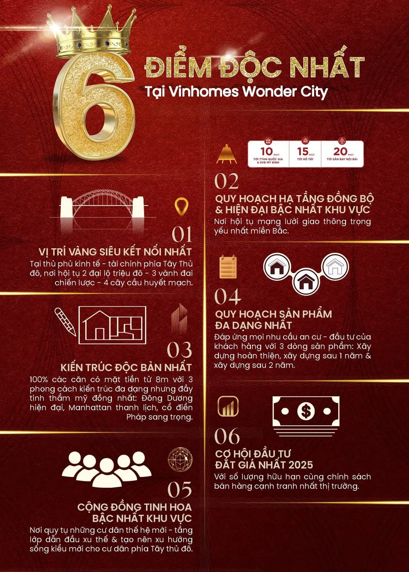 Vinhomes Wonder City không chỉ là một khu đô thị hiện đại mà còn là một thành phố thu nhỏ với hệ thống tiện ích đa dạng, đẳng cấp quốc tế. Dự án tự hào sở hữu loạt công trình biểu tượng mới của Thủ đô, mang đến cho cư dân một cuộc sống tiện nghi, hiện đại và đầy trải nghiệm.