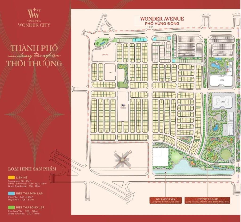 Một trong những điểm nhấn nổi bật trên mặt bằng tổng thể Vinhomes Wonder City là quy hoạch đồng bộ và tầm nhìn phát triển bài bản. Dự án được chia thành hai phân khu đô thị chính với phong cách riêng biệt: