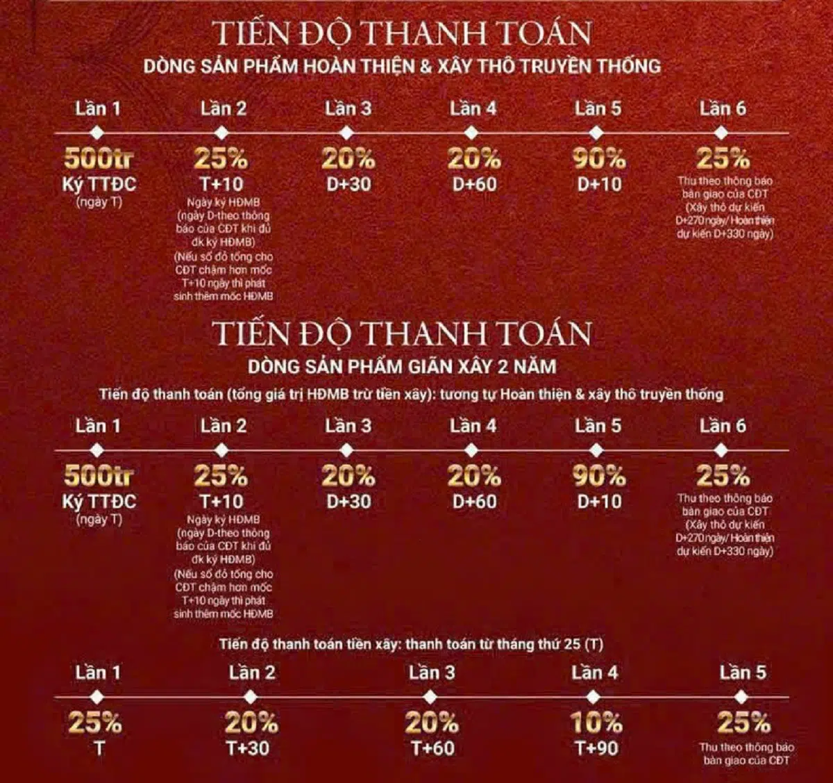 | Thanh toán theo tiến độ chuẩn | Thanh toán linh hoạt theo từng đợt gắn với tiến độ thi công. Khách không vay được chiết khấu 3,5%; thanh toán sớm từng đợt vẫn được hưởng lãi suất dòng tiền. |